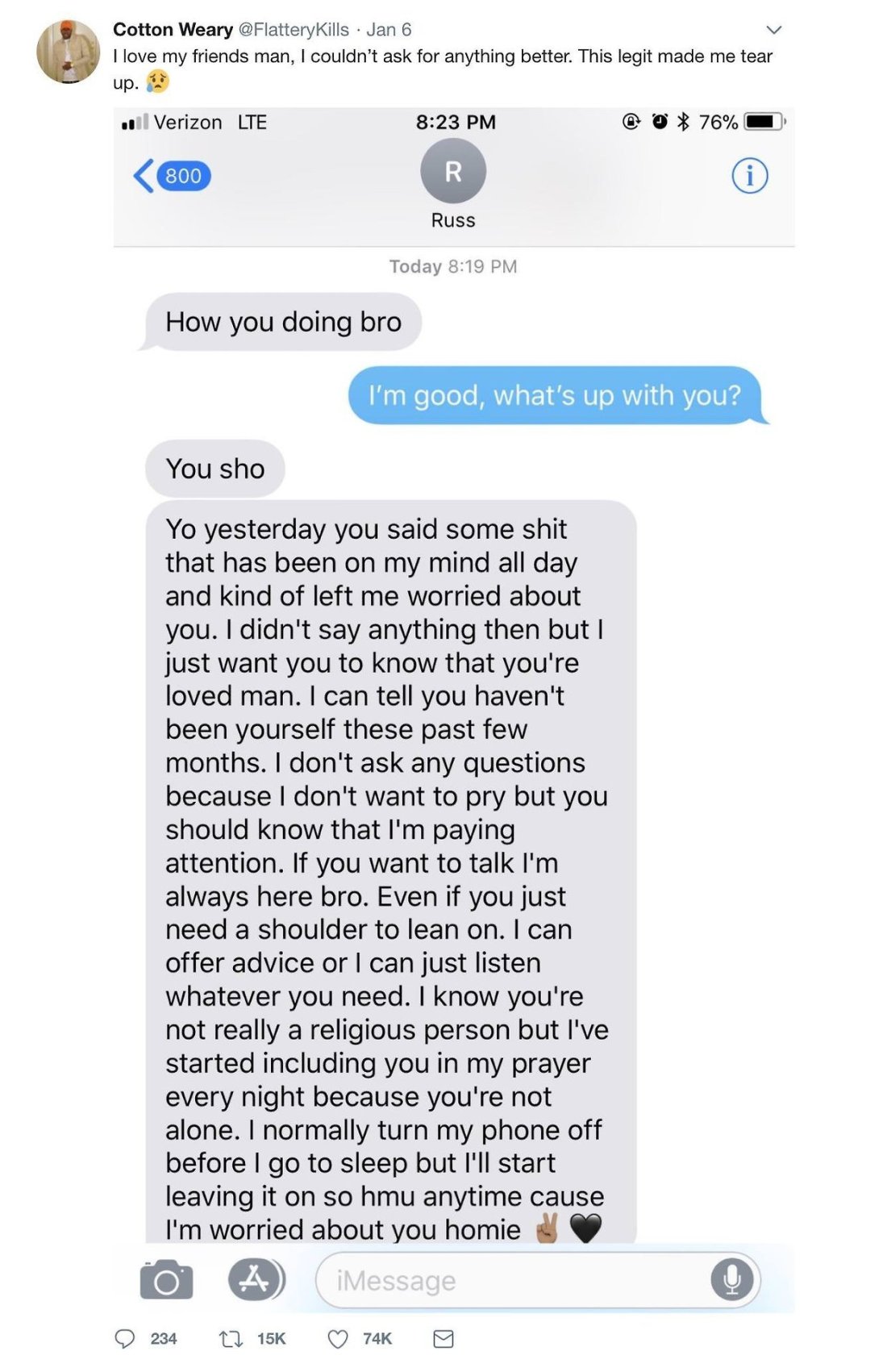 We really need to normalize this because I know my life would be a helluva lot more loving if I had support like this from “homies”. Conversation should be more than just about bitches and catching a buzz. I try but where’s the reciprocated energy?