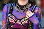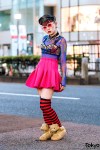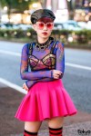Japanese nail artist Maiko Neuron on the street in Harajuku wearing a sheer Dolls Kill top with a holographic bustier top, a pink pleated skirt from New York Joe, and Jeremy Scott x Adidas gold teddy bear sneakers. Full Look
